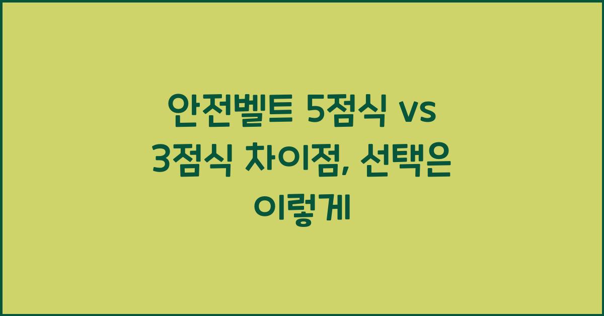안전벨트의 중요성자동차를 운전할 때 가장 먼저 떠올리는 것이 바로 안전벨트입니다. 안전벨트는 탑승자의 생명을 지키는 가장 간단하면서도 효과적인 장치인 만큼, 선택에 신중을 기해야 합니다. 특히 안전벨트의 종류에 따라 보호 수준이 달라질 수 있으므로, 안전벨트 5점식 vs 3점식 차이점을 잘 이해하고 선택하는 것이 매우 중요하다고 할 수 있습니다.5점식 안전벨트란?5점식 안전벨트는 일반적으로 자동차 경주나 고성능 차량에서 사용하는 장치입니다. 이 안전벨트는 어깨, 가슴, 허리까지 총 다섯 개의 부분으로 이루어져 있습니다. 이러한 구성 덕분에 탑승자는 차량이 급정거하거나 충돌할 경우 더욱 효과적으로 보호받을 수 있습니다. 특히 레이싱 상황에서는 더 강력한 지지를 제공하여 운전자의 안전성을 크게 향상시킵니다...